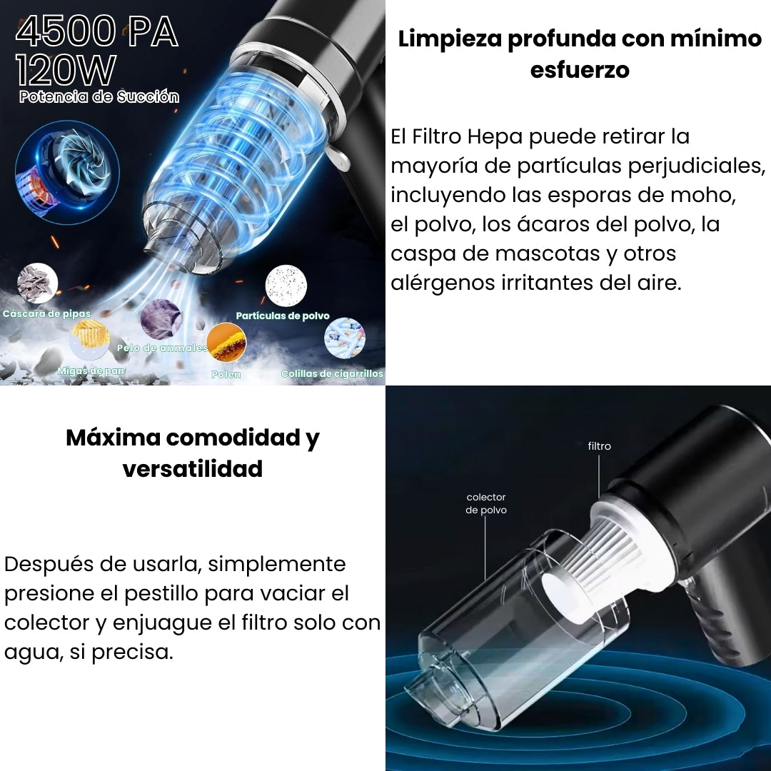 La PowerVac 360 es una aspiradora portátil e inalámbrica, perfecta para eliminar polvo, migas y pelo de mascotas en cualquier lugar. Su potente succión de 4500Pa garantiza una limpieza eficaz en sofás, mesas, rincones difíciles y en el interior del coche.